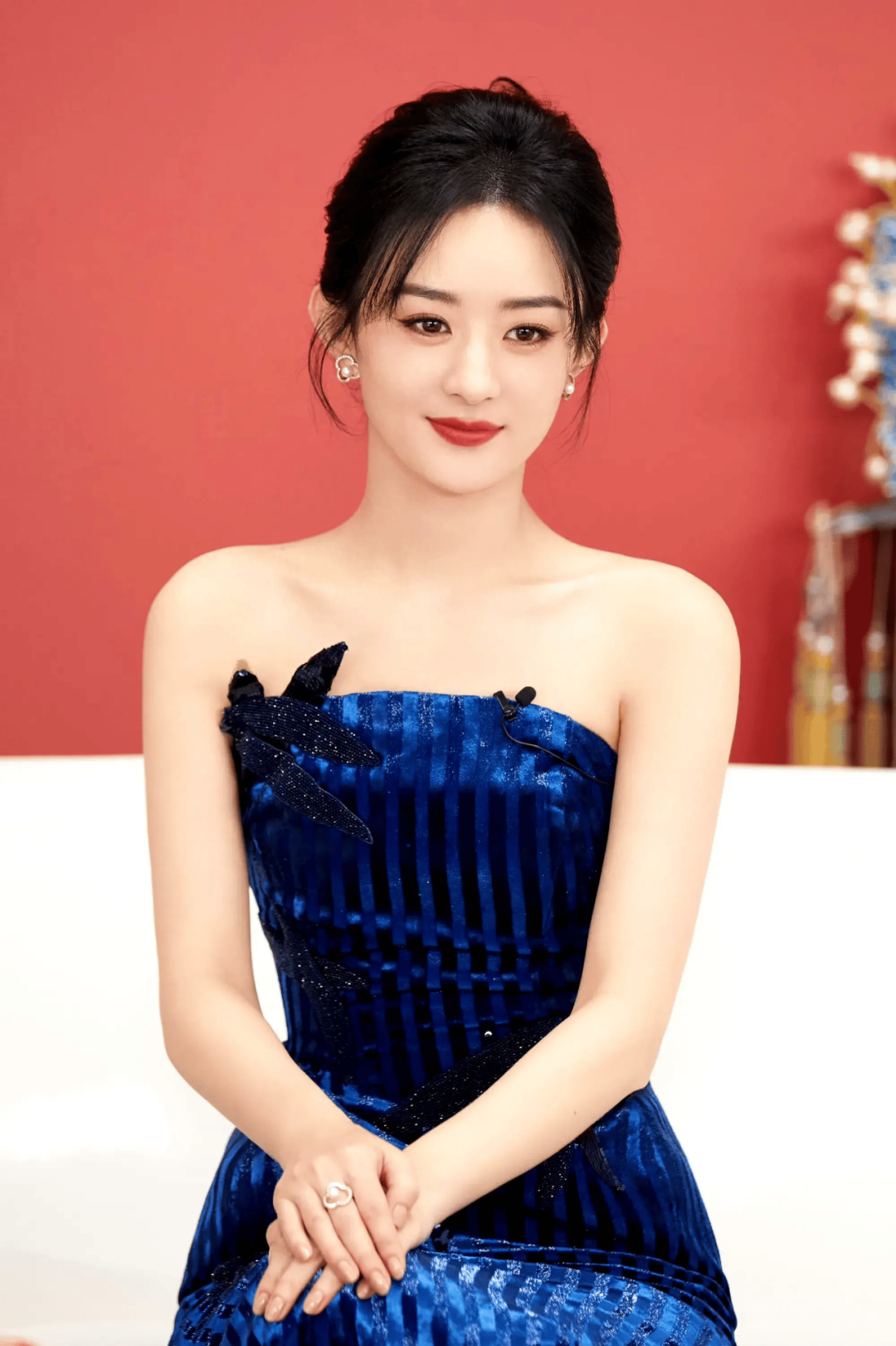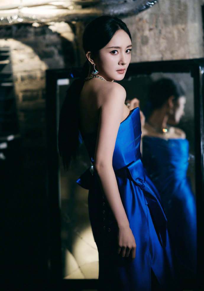 杨幂穿着Schiaparelli宝石蓝高定礼服亮相时,所有镜头都对准了她。